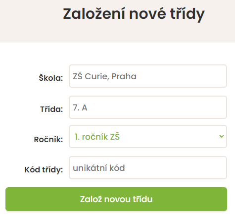 Vyplňte potřebné údaje a zvolte si kód třídy. Ten může být jakýkoliv. Důležité je, aby byl unikátní.
