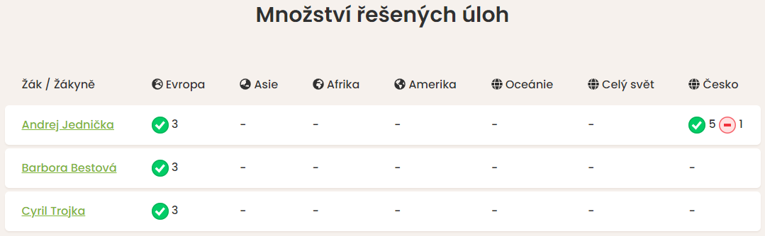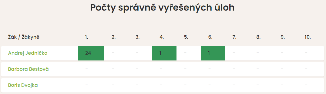 U každého žáka naleznete přehledně graficky zpracované počty vyřešených úkolů. Množství správných řešení je znázorněno spektrem barev od zelené (více správných řešení než ostatní) po červenou (méně správných řešení než ostatní). Znázornění je pouze orientační, teprve po rozkliknutí profilů naleznete úkoly a jejich řešení konkrétním žákem.