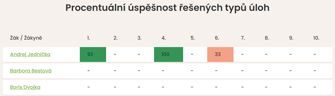 - Statistika, kolik úkolů žák vyřešil správně v rámci jednotlivých typů úkolů